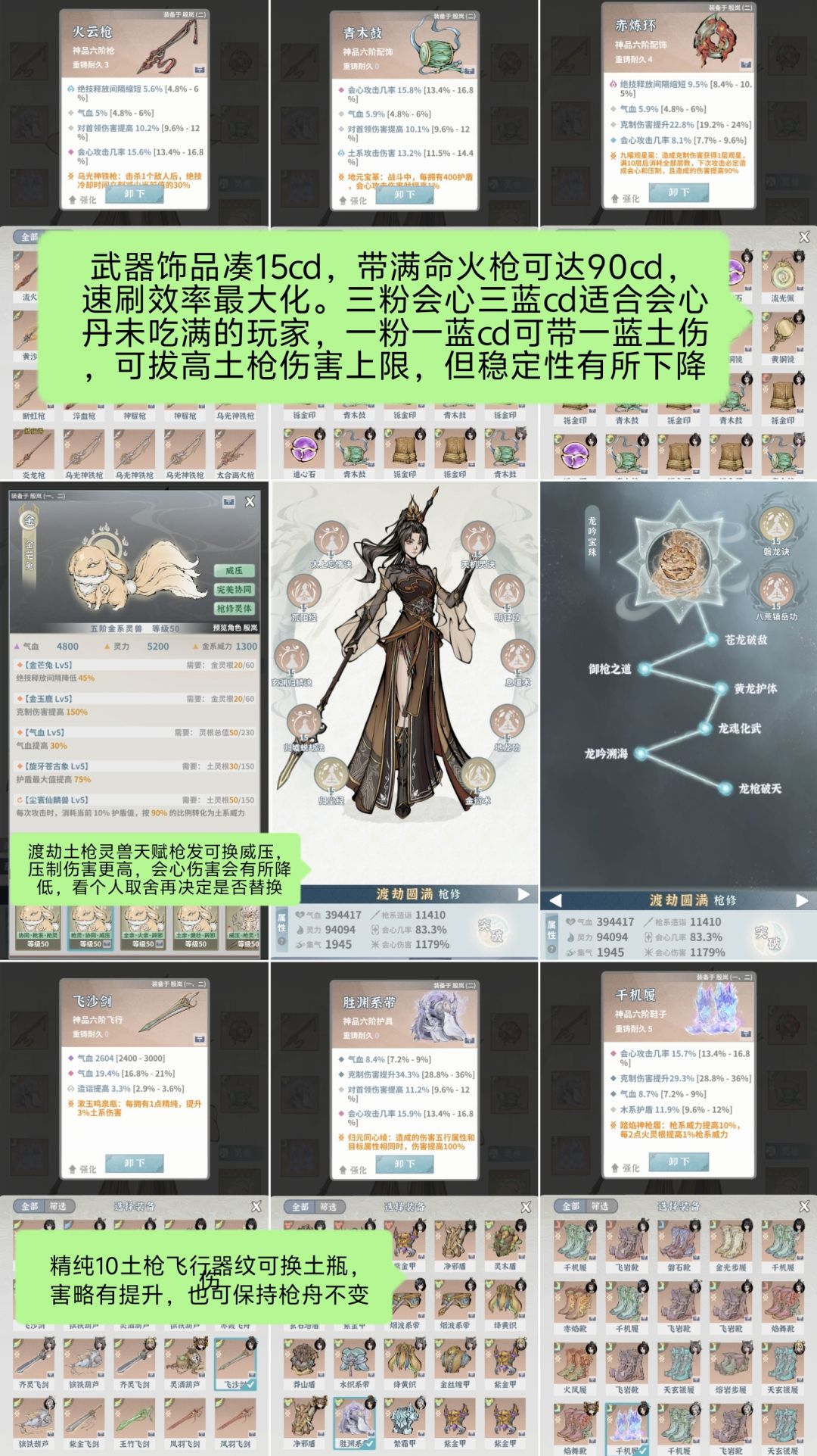 此配置实测零丹配合满命火枪在梦11秒伤能达到120亿,武器饰品建议搭配是三粉会心三蓝cd,次选词条为气百/五行护盾、首领伤/克制伤。若无满命火枪仅适合速刷使用,而高练度土枪则可以配合满命火枪,即使在中高层梦魇塔也有不俗的战力。高练度玩家(丹药较多)可以采用一粉cd一蓝会心+一粉会心一蓝cd的方式凑求15cd,而剩下的那个装备则可以采用一粉会心一蓝土伤,次选词条同上。新器纹土瓶实测伤害略高于枪舟,且具有成长性,综合对比土瓶更好。