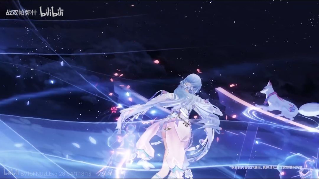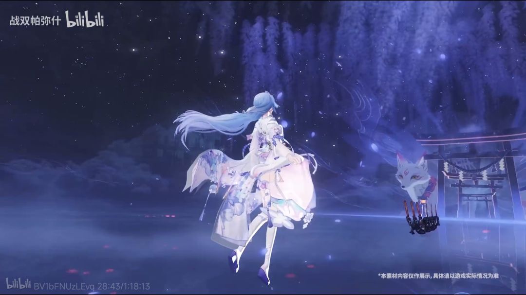 * 战斗特效:从战斗截图中可以看到,技能特效以淡紫色和蓝色为主,伴有飞舞的花瓣、星辰般的光点以及一只半透明的灵狐随行。这只灵狐不仅呼应了面具,更在战斗中成为了一个具体的视觉元素,强化了“神使”或“巫女”的设定,使得整体设计的神圣感和幻想色彩更加浓厚。特效华丽而不俗气,与角色动作的契合度极高。