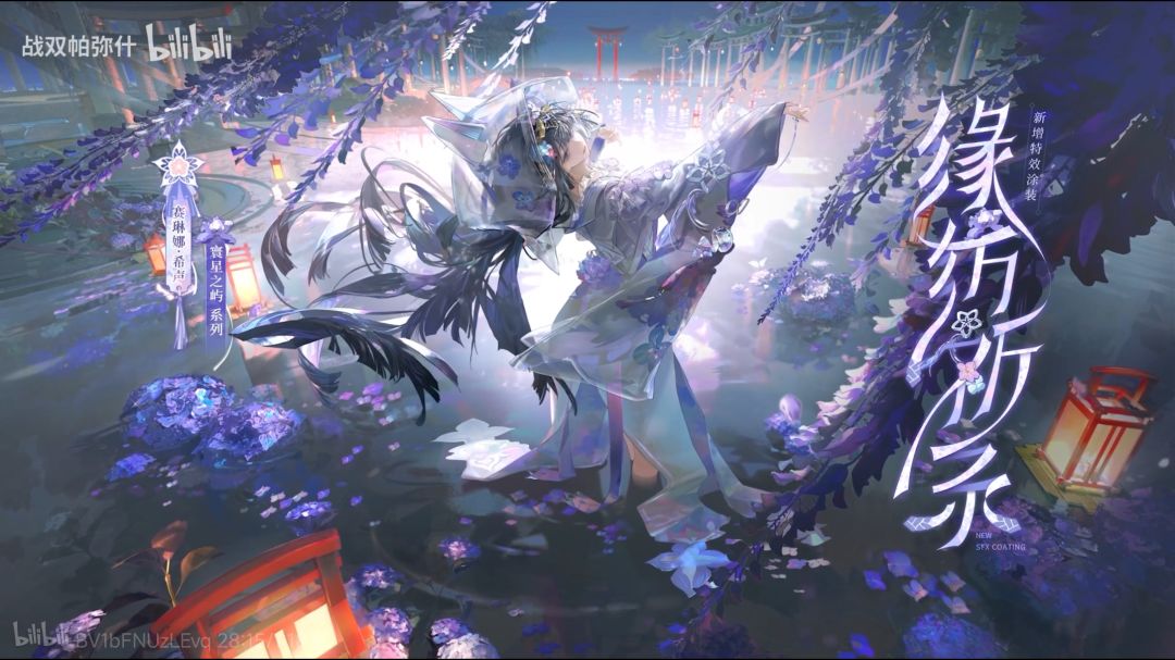 整体氛围宁静、唯美、浪漫,带有浓厚的日式古典韵味。它营造了一种“月下花前,仙子降临”的诗意意境,仿佛是在樱花或紫藤花下进行一场古老而神圣的祈福仪式。皮肤的命名也强化了这种与缘分、祈愿相关的浪漫意境。