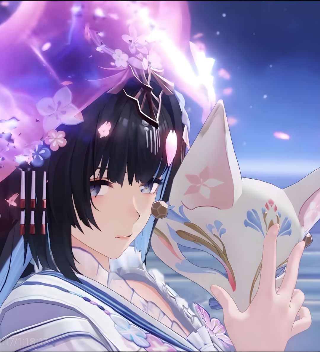 * 发型设计: 乌黑的长发搭配带有花饰和发簪的头饰,显得古典而雅致。露出的耳朵部分设计也很精巧,增添了几分狐狸或神兽的神秘感(尤其是在戴着狐面具的图片中)。