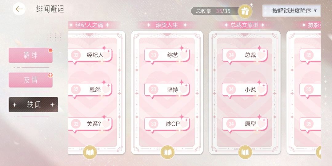 绯闻系统已上线,艺人们点击主界面剧本按钮下方的【绯闻】入口,即可进入绯闻邂逅界面。在绯闻邂逅系统中,艺人们可查看已解锁的三种类型卡牌:羁绊卡、友谊卡,以及轶闻卡。