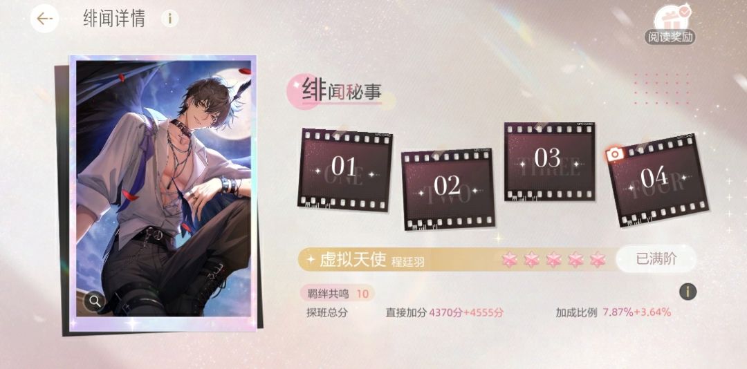 每张羁绊卡都有专属“绯闻秘事”剧情,分四段故事,分别在卡牌1/3/6/10阶时解锁,阅读故事可获得对应的阅读奖励~