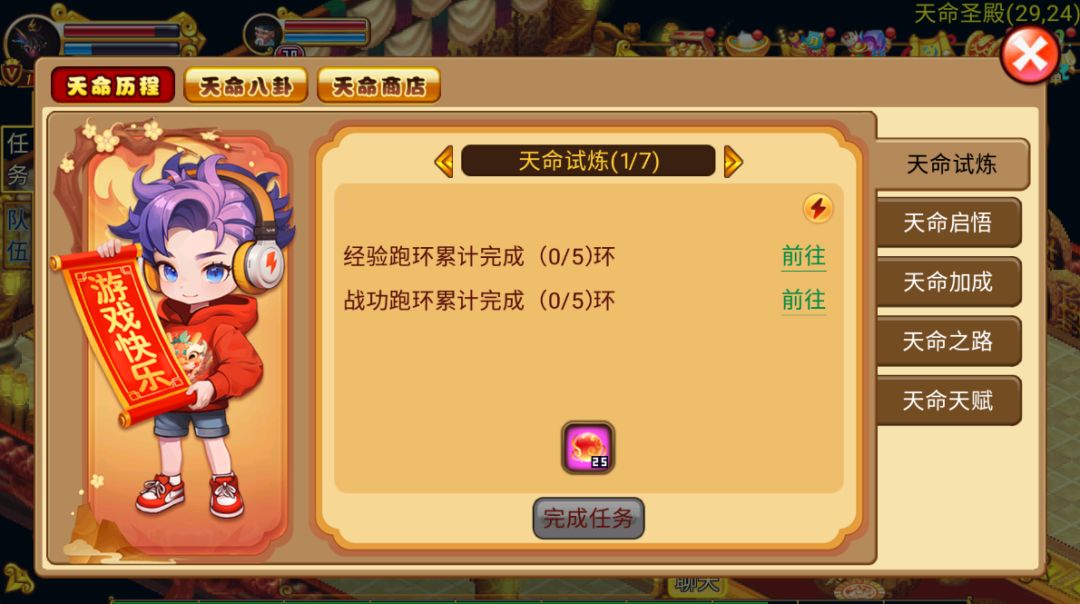 完成全部7个天命试炼任务,你将成功晋级,天命启悟、天命加成等丰厚福利即刻到账。