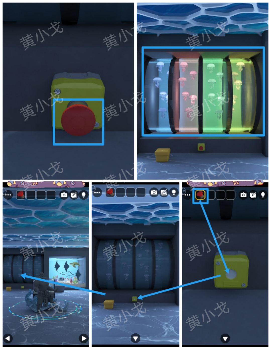 16.点击水母水族箱前面的开关装置,装上并按下【按钮】,打开水族箱的灯,获得线索