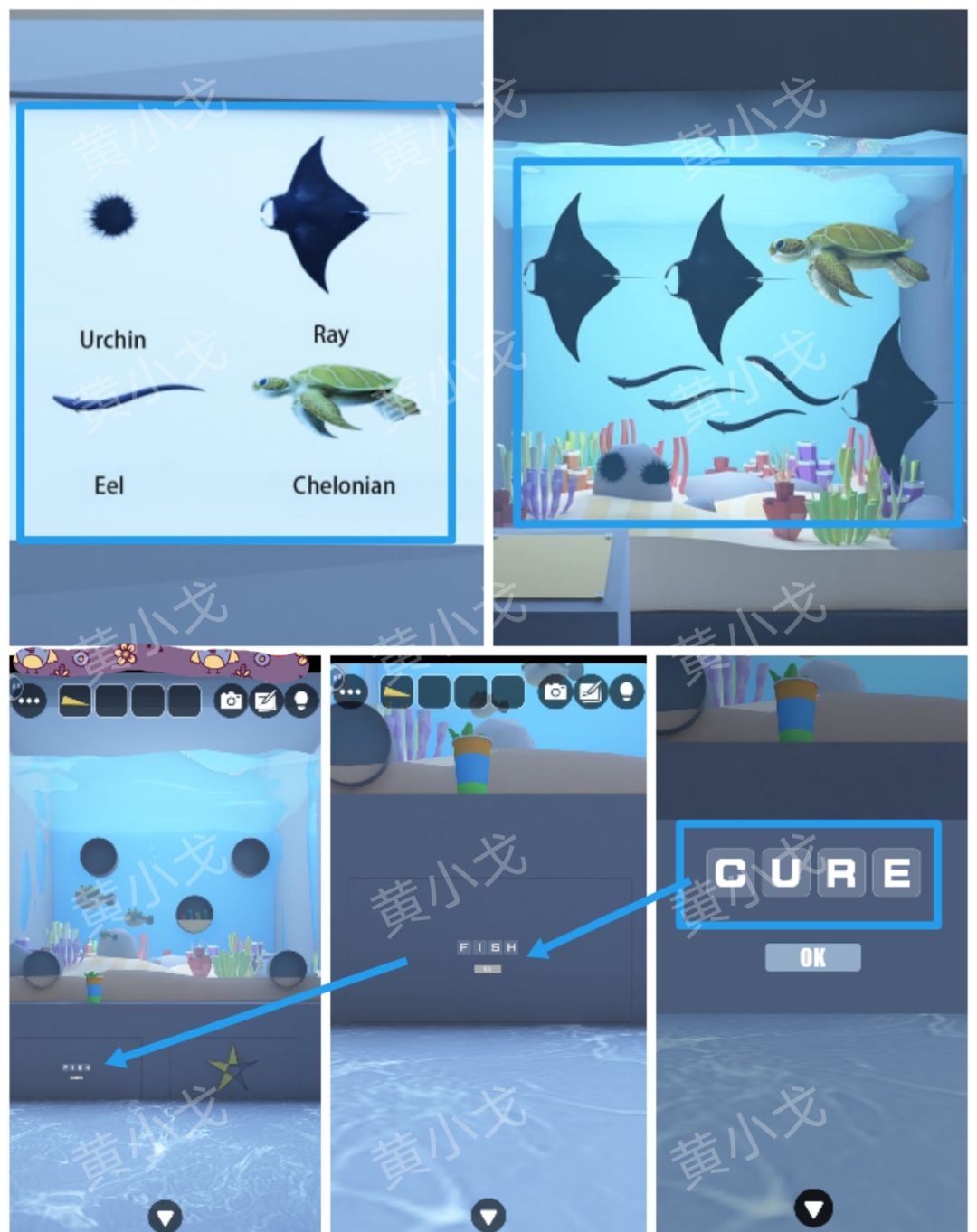 19.点击水族箱左侧柜门上的密码锁,根据[水母]场景右侧水族箱里的动物种类和数量线索、面板上的介绍图线索,输入密码:CURE