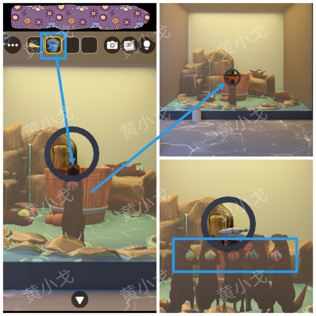 24.点击架子上的鱼装饰品,根据[灯笼鱼]场景水獭脖子上的装饰品的颜色线索,调整对应颜色的鱼的位置