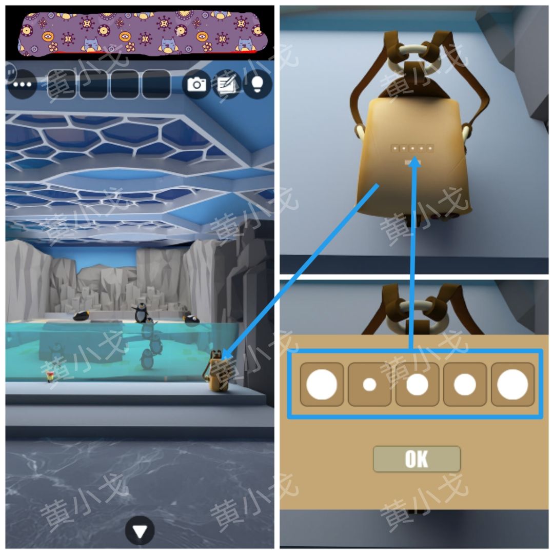 2.点击柜子左侧柜门上的密码锁,根据[企鹅]场景钥匙扣颜色及数量线索,调整密码锁