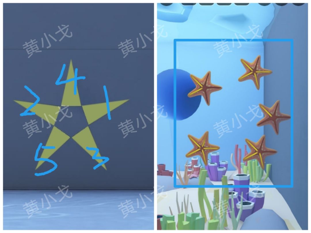 🔶海星的位置及上面的黄色线条数量