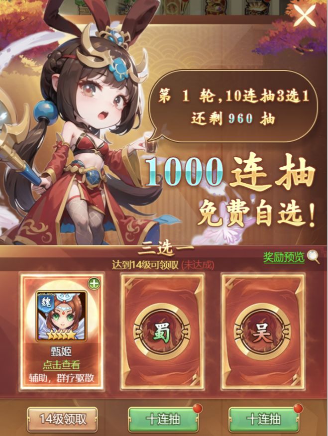 送武将千抽自选上线送千连,神将皆有缘!招募抽卡不花钱,轻松集齐稀有武将!主公通过持续升级,可以获得共1000抽自选武将,主公可根据阵容需要,随心选择,一次抽个爽。搭建出最适合自己的阵容,轻松智斗!快来体验超值福利,享受抽卡的乐趣吧!