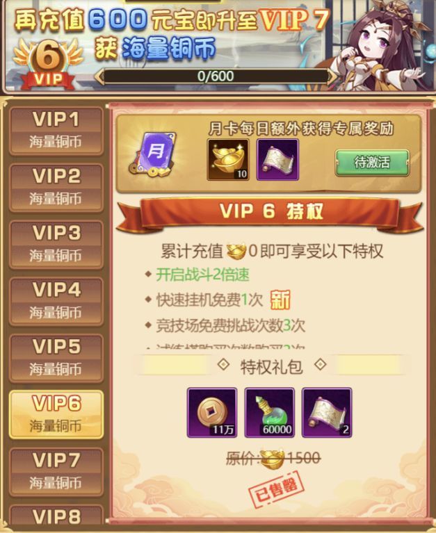 免费VIP特权上线就送VIP 6!白给大量特权,包含快速挂机、战斗倍速、经验加成,以及海量武将升级材料!助您快速上手,轻松上位,挂机不掉队!