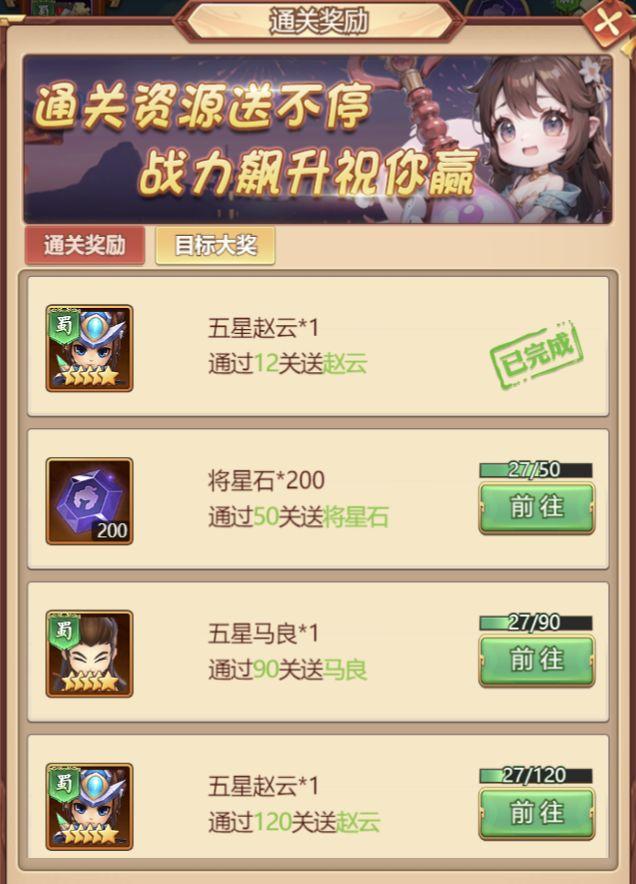 通关送五星赵云通关奖励送不停,战力飙升爽翻天!游戏中达成指定关卡后即可获得海量资源奖励,更有五星赵云、红品神装等着您,武将各显神通,策略搭配百战百胜!