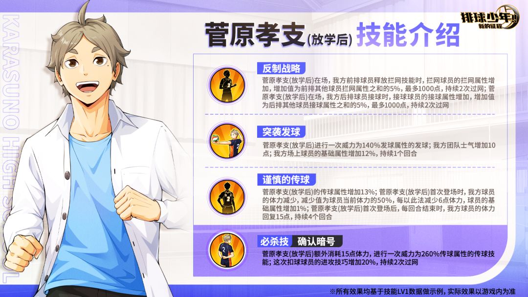 菅原孝支(放学后)的传球属性增加;菅原孝支(放学后)首次登场时,我方球员的体力减少,球员的基础属性增加;菅原孝支(放学后)首次登场后,每回合结束时,我方球员的回复一定体力。