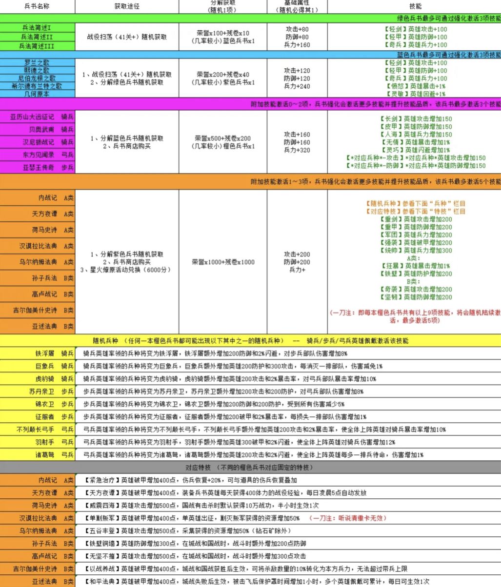 这几天终于升级到了105,接触到兵书系统,然而我发现很多人对兵书有些迷茫,各自有各自的理解不能形成系统化的东西,为了自己不踩坑也顺便可以帮萌新们探探路所以我用了近4小时反复搜集比对资料做出下面表格。