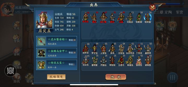 装备建议:二阶轻骑套和二阶女兵套,魏征带加一马,冯盎带双倍斧sl双倍,屈突盖套装加玉玺,其它套装或满级随刃!