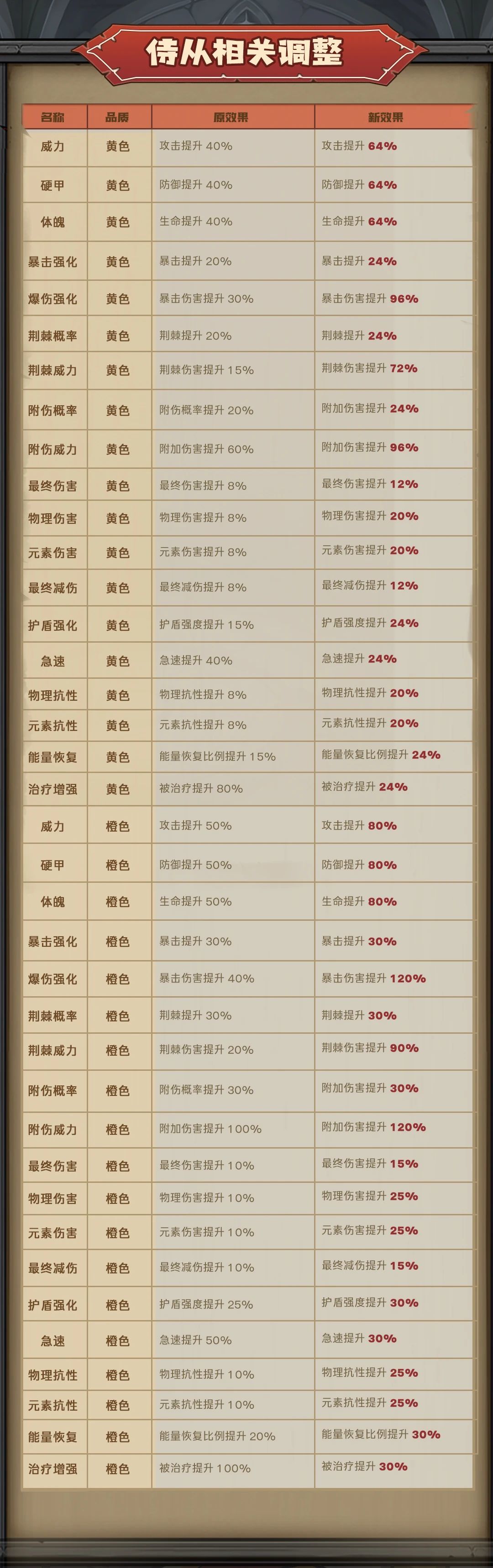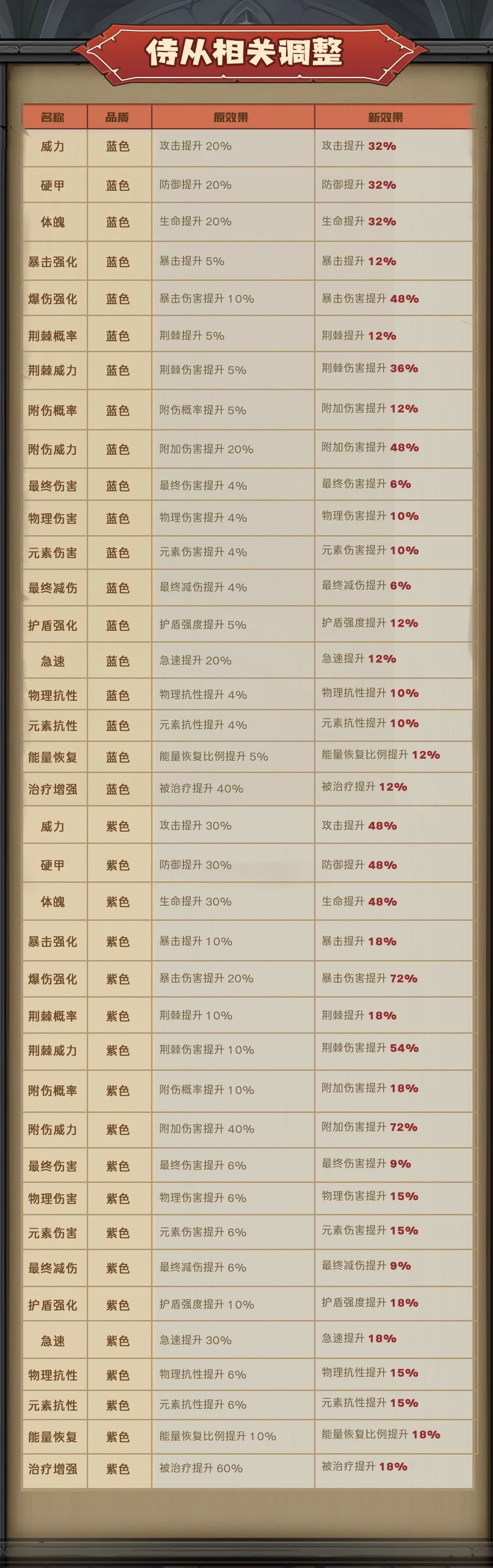 1、玩法优化:侍从天赋效果仅对侍从自身生效。