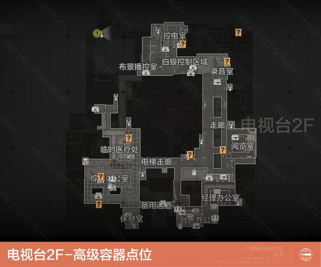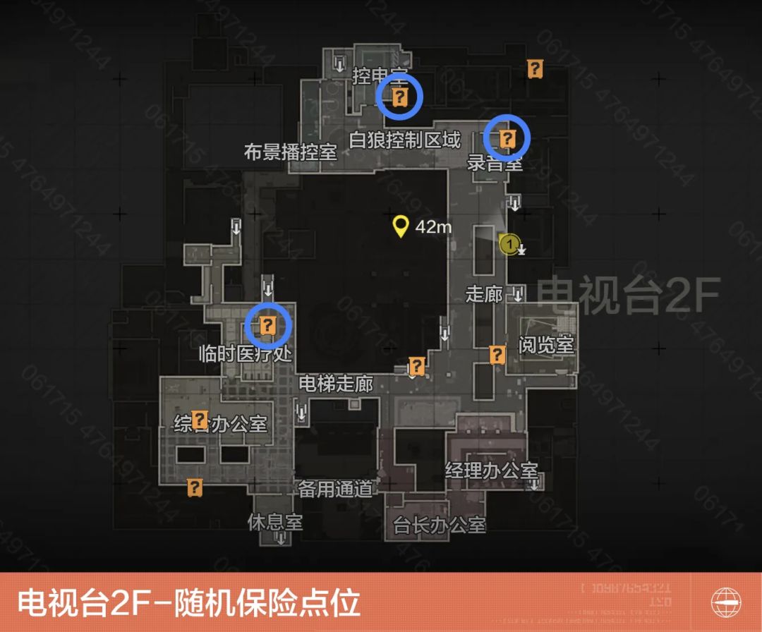 电视台内部共有8处随机保险刷新点。在1F区域内有5处,分别位于停车场、后勤区-餐厅、中控区域-演播厅、办公区-第一制作部、摄影区-录影棚;在2F区域内有3处,分别位于控电室、录音室、临时医疗处。