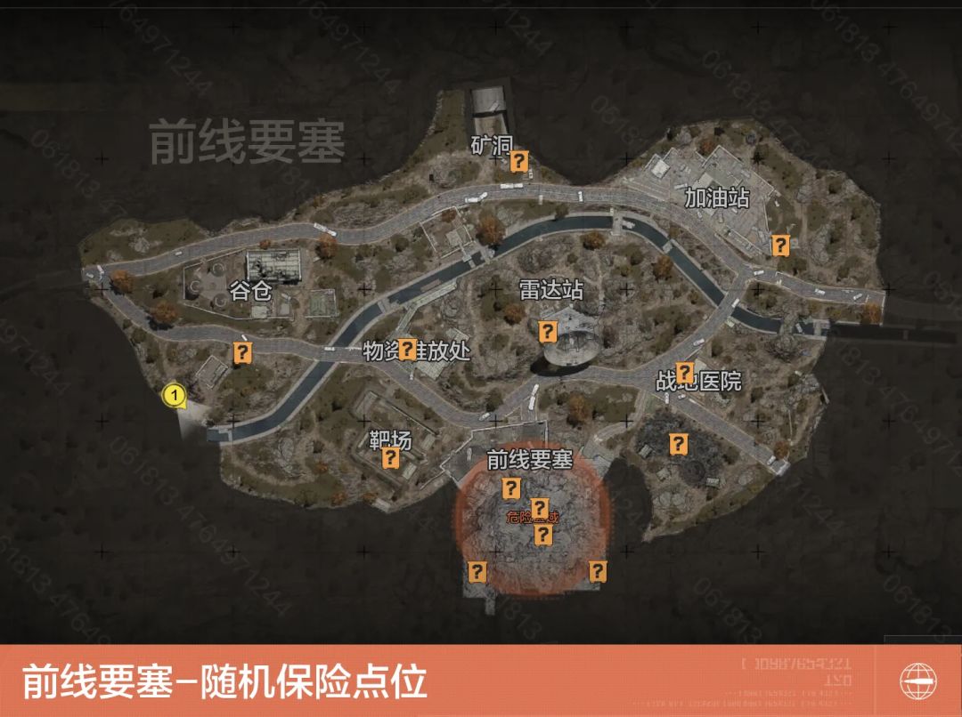 前线要塞地图中共有13处随机保险刷新点,分别位于矿洞、加油站、谷仓、物资堆放处、雷达站、靶场、战地医院、前线要塞内部。