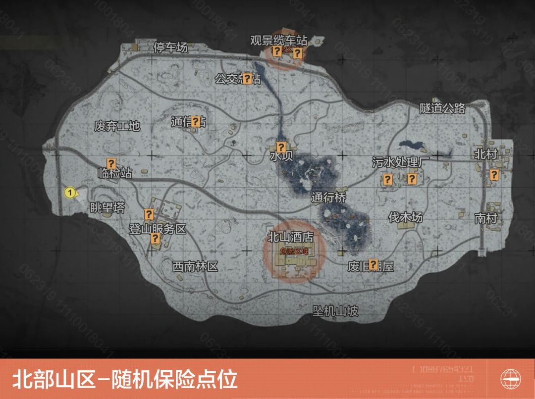 北部山区中共有12处随机保险刷新点,分别位于观景缆车站、公交总站、通信站、临检站、登山服务区、水坝、污水处理厂、北村、废旧棚屋内。