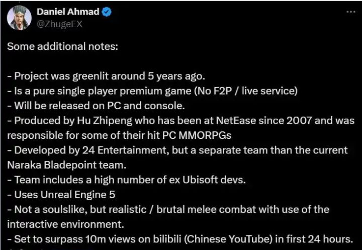 市场研究机构 Niko Partners 研究总监 Daniel Ahmad 在 6 月 21 日分享了《归唐》的一些细节信息: