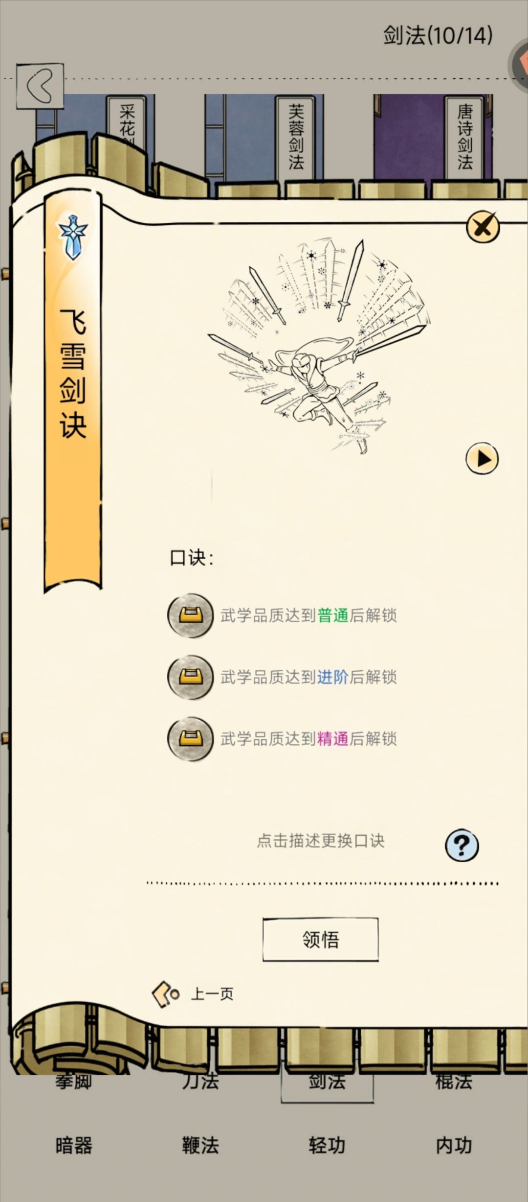 飞雪剑诀拆招,命中提升20,自身剑气六层及以上时拆招额外增加10