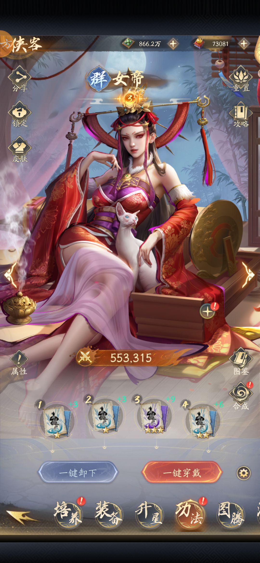 1.功法:李星云天罡绝,阳叔子、霸雪五雷天心,降臣殒生(其他的也凑不齐),许幻天罡(还没凑齐一套),女帝幻音。功法的选择性不多,基本上看技能就知道带什么了。