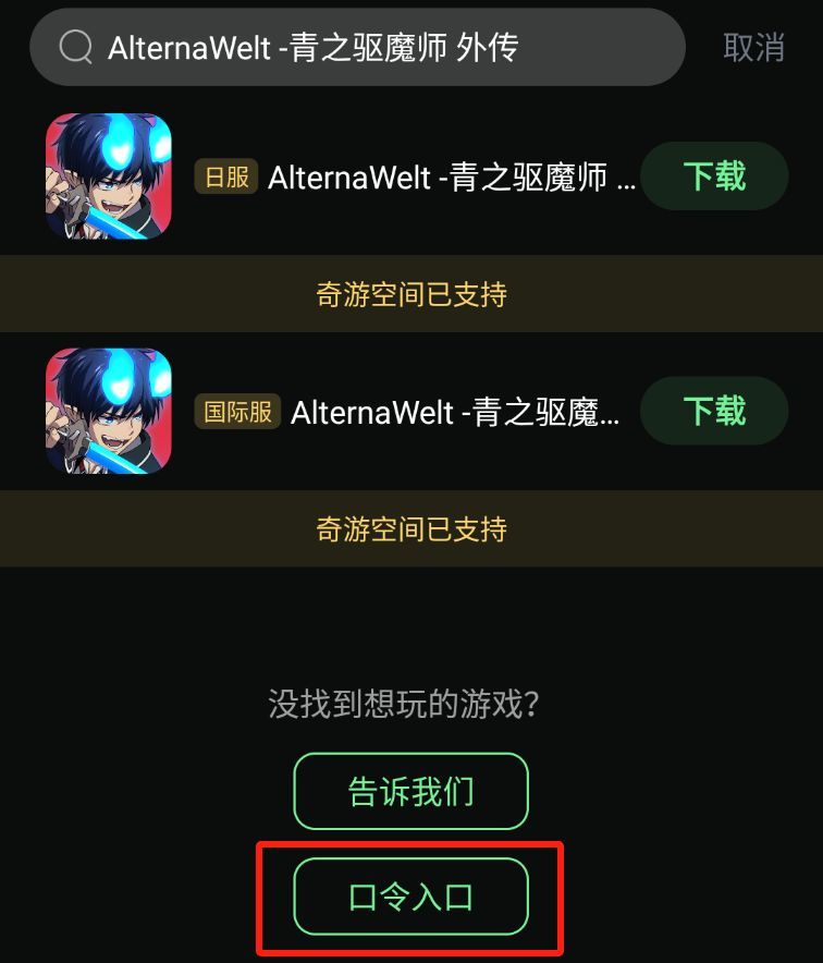 第二步:安装好奇游手游加速器后,搜索【青之驱魔师】找到口令入口,输入兑换码【AW】领取会员时长