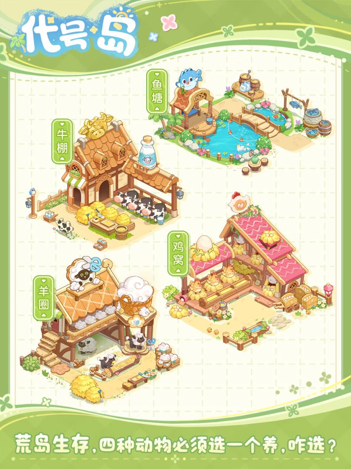 (◕ᗜ◕)✧ 岛主大人~布洛在荒岛上发现了野生鸡棚,牛棚,羊棚和鱼塘!生活品质大提升!但是只能选一个,好纠结啊!岛主们快来帮布洛选一选,你们最爱哪一个呢?(●°u°●) 」