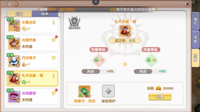- 继承规则:花费2万金币即可转移附魔效果,虽存在等级波动概率,但相较强化/洗练的完全重置,仍是最优保值选择。