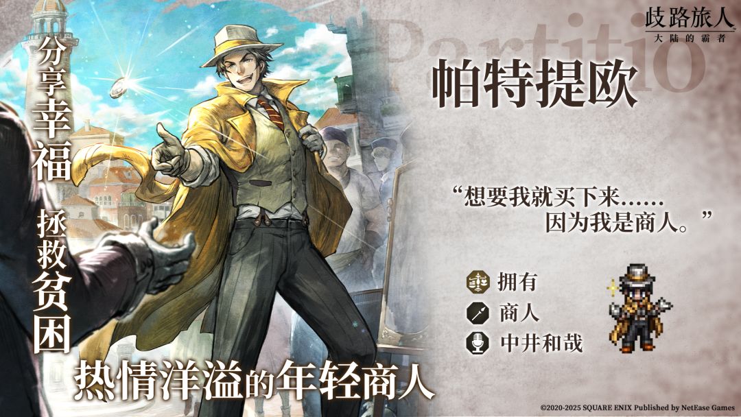 2、新增限时阶梯引导:“索里斯帝亚的追忆”,阶段5必定获得1个5★及以上旅人,50%的概率获得6★商人“帕特提欧”,阶梯引导中可获得索里斯帝亚的追忆导片、交汇的导片。