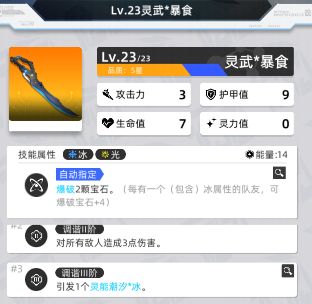 这是第一把,冰光武器,我习惯称呼它为“水刀”。好处在于爆破宝石,同时队里每有一个冰属性队友,就能增加4个爆破的宝石,所以,对于萌新,没有好的充能去启动“雪”的情况下,可以主角佩戴“水刀”放在前排,2号位放冷落雪(电量篇有提到,开局许愿可选择),3、4号为放带“冰”属性的卡,这样最大程度的实现爆破数量,更快充能。并且调谐3阶可以引发灵能潮汐,在没有雪或者雪还未发动技能的情况之下,可以做到加速我方冰属性启动的效果。打冰属性月活最高难度好用。