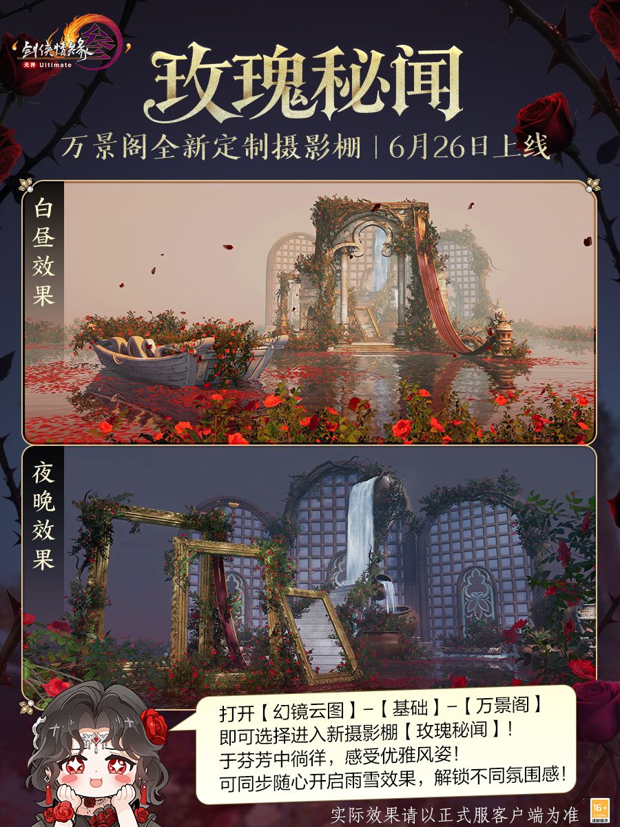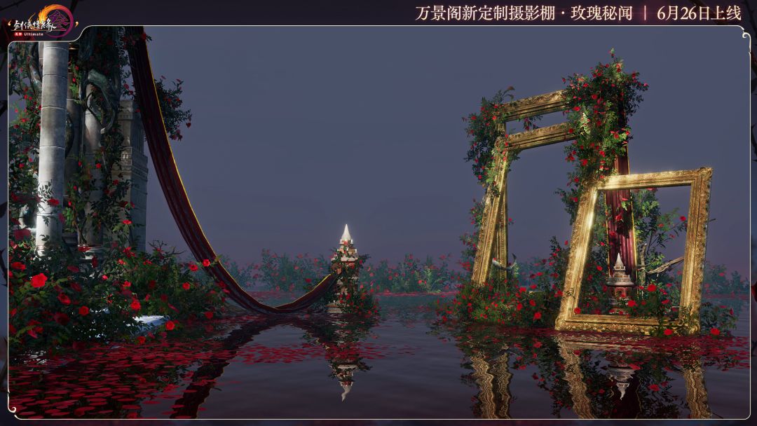 万景阁全新定制摄影棚“玫瑰秘闻”即将同步上线,万千朵玫瑰交织立体花境,水面如镜铺陈脚下,步步轻踏碎开粼粼光影,绯色花瓣随涟漪漾开诗篇,复古美学于此层层绽放。这里不仅可随心切换白昼与夜晚光照预热,更可自由开启雨雪效果,构筑多重氛围感舞台。无论是复古优雅的细腻质感,还是神秘幽然的情绪张力,踏入其中,成为光影戏剧中的唯一主角吧!
