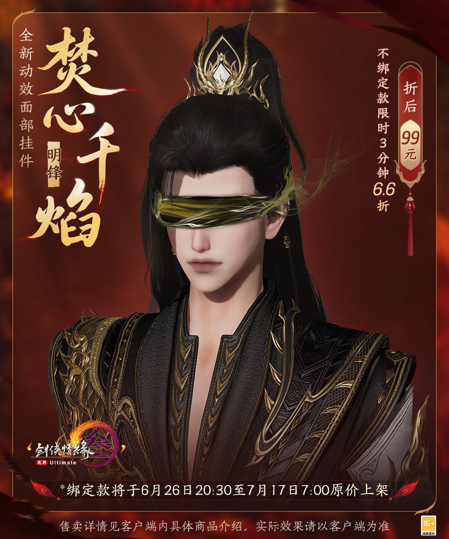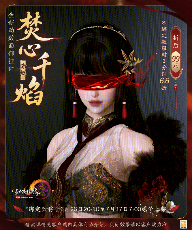 全新动态光效面部挂件“焚心千焰”飘逸烟纹氤氲灵动,共三款颜色可供选购。其中,不绑定款限时3分钟6.6折专属优惠,折后99元!红色款如赤火裹挟罡风掠过,倏然浸染血魄,鲜艳锐利醒目非常。黑色款则别具清冷韵味,恰似寒江独钓时的半江夜色,寂然暗藏凛冽。金色款以宫阙深处的第一缕曦光为笔墨,衬托华贵气质,随息煌煌。缚目轻绸与云雾特效相得益彰,烟影月辉皆入韵,刚柔并济总相宜。
