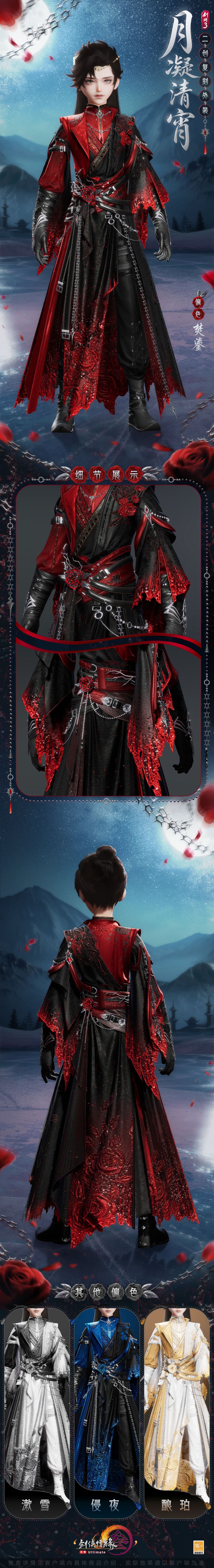 男款以立体廓形勾勒挺拔身姿,冷峻如刃裁开暗夜气场,锁链交错缠绕,暗纹攀附花魂冲破荆棘桎梏,折射幽芒。女款裙裾腰间洇染殷红纱绸,边缘处更有星屑旋出微光。血墨玫瑰盛放至极,于幽夜应和华美舞步,成就炽烈之梦。