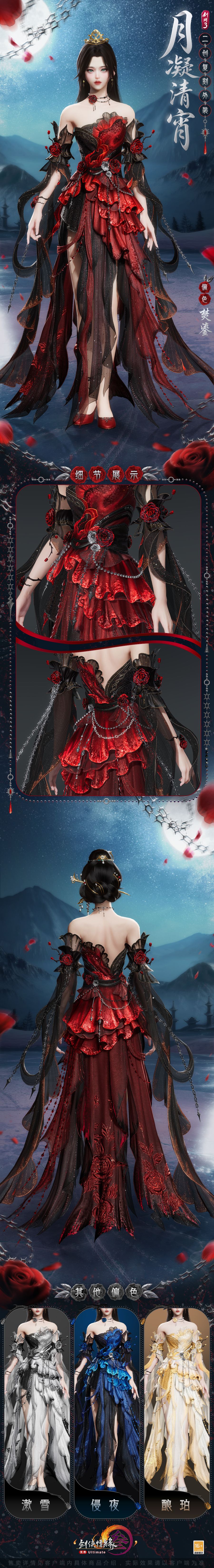 火绡灼尽,绛炬燃香,全新二创复刻外装“月凝清宵”将炽焰与玫瑰芳息铸入华裳,绡纱翻卷如火舌舐空,裙裾翻卷似烈焰焚灼,共有四款偏色可供选购。