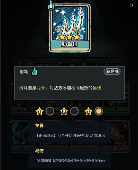 肋骨,0费超越牌。本身没有实际作用,需要配合自身BUFF“龙骨”才能产生效果。效果与自身“龙骨”BUFF挂钩,清除自身“龙骨”BUFF,给目标添加DeBUFF“易伤”。卡牌消耗0费,无“移除属性”。套用小白的一句话