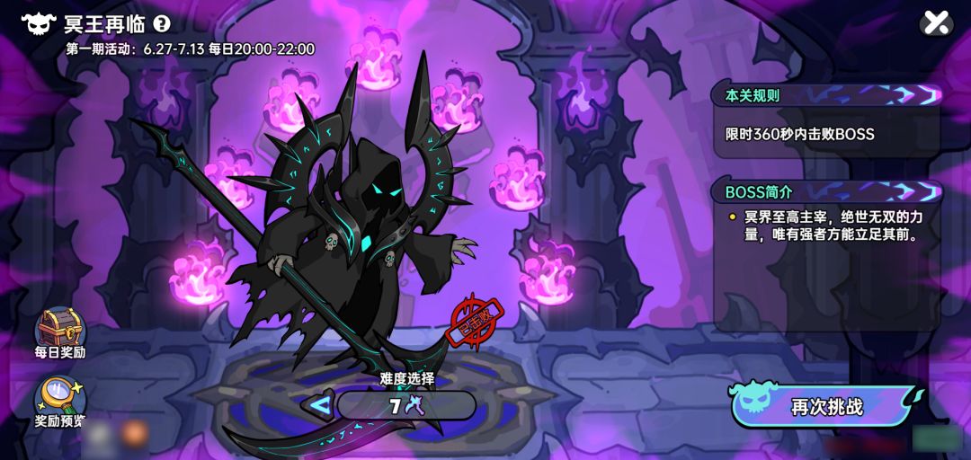 勇士们每日可多次挑战不同难度的冥王,但每日奖励仅可领取一次,领取后当天将无法再次领取,请注意确认奖励哦~