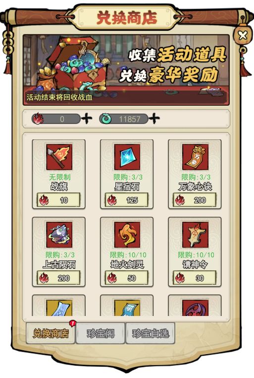 活动期间,在万剑朝宗中获得的“战血”,可至兑换商店处兑换珍稀道具