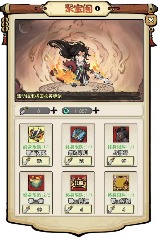此外,每累计抽奖100次可获得1个英魂剑,可在聚宝阁中兑换霸王别姬主题独有的奖励哦~(具体奖励内容可前往聚宝阁玩法中查看~)