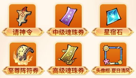 活动期间,累天充值最高可领取“请神令、中级魂珠券”珍稀奖励;如累充达到一定金额还能领取“星宿石”、“至尊阵符券”、“高级魂珠券”、“头像框-夏日清风”等等大礼哦~快来获取你想要的道具吧!