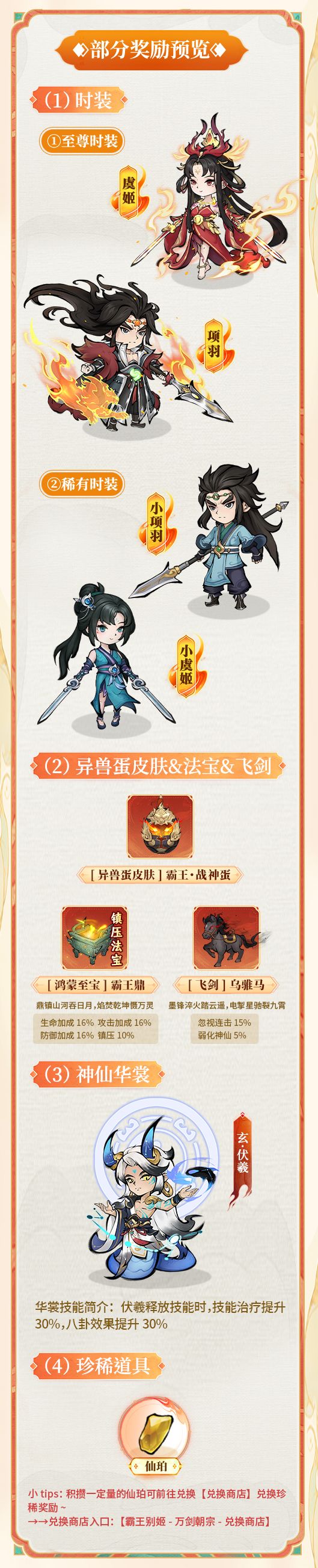 活动期间,聚宝阁中包含了霸王别姬主题活动的独有奖励,包括联动“至尊时装、稀有时装、法宝、飞剑、头像框、称号”以及其他珍稀道具奖励哦~建议仙友们趁着返场活动尽早兑换你想要的道具奖励哟~~