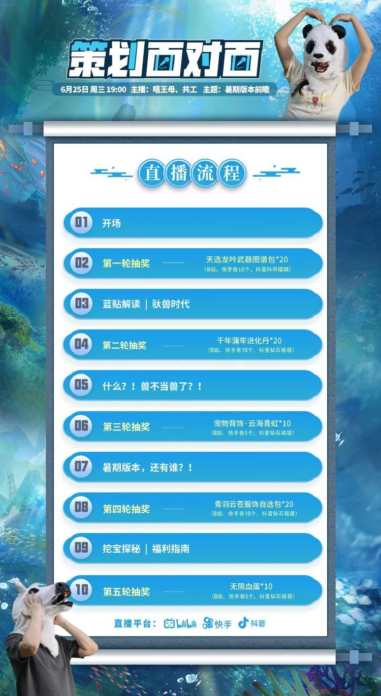 6月25日(本周三)19:00,前往B站、抖音、快手三大平台官方直播间,与策划共工、嘻王母面对面,一起畅谈暑期新版本(PS:各位旅者可以选择自己喜欢的平台进行观看哦)!