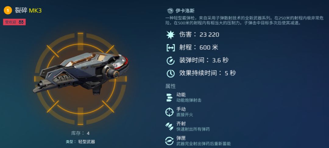 “减速喷”的输出能力优秀,装弹速度快,是现阶段机甲武器队列中唯一具备"减速"特效的武器,在战场上表现出出色的持续作战能力和追击性能。
