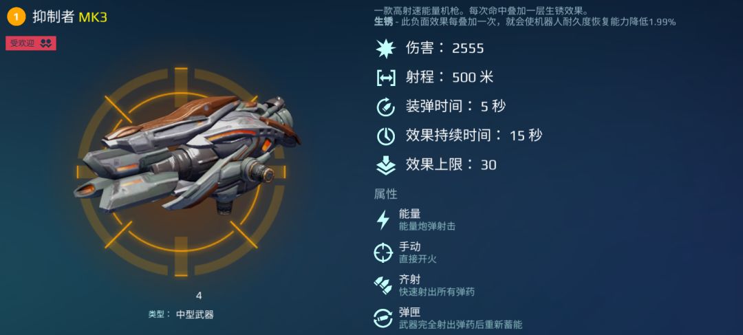 该系列武器具有独特的“治疗削减”效果,无需依赖武器练度,即可有效克制“强依赖续航技能续能”的敌方机甲。因此,其作为辅助型机甲的武器搭配使用,同样表现出色。