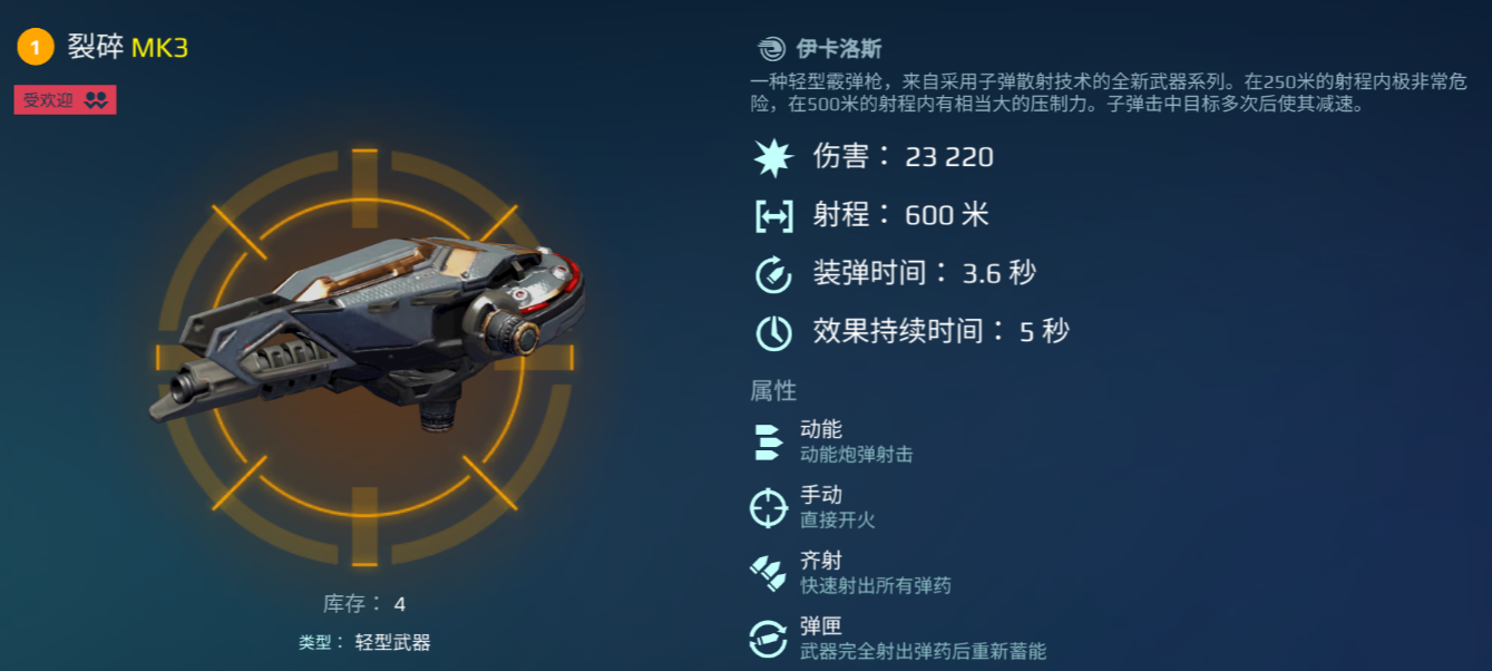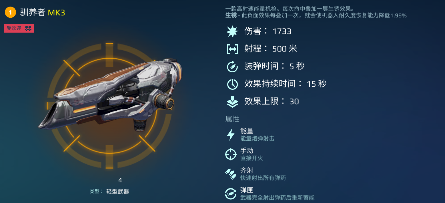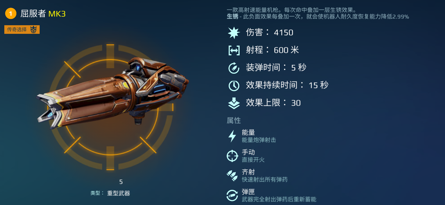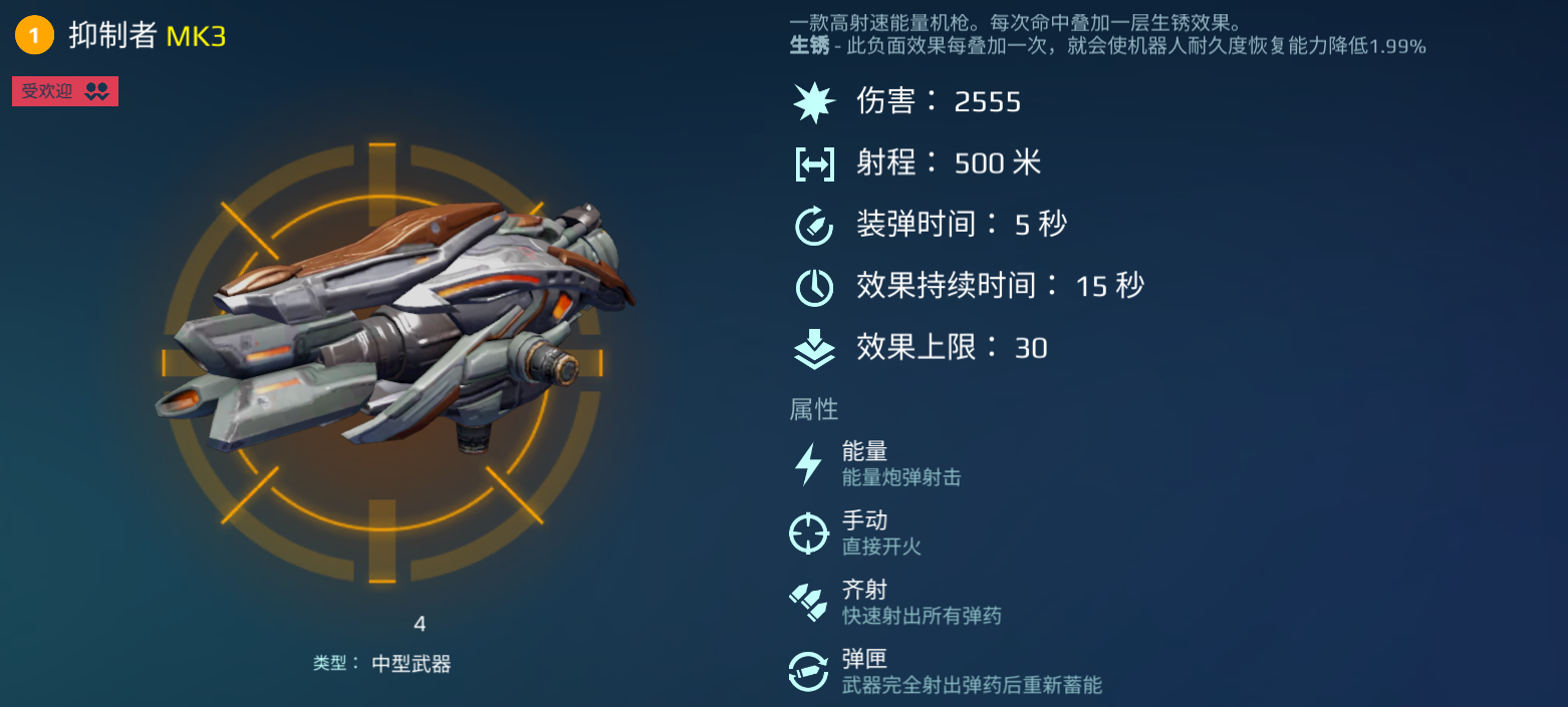 "锈枪"系列武器为高射速能量机枪,输出能力强,适合作为主战机甲的标备武器储备。