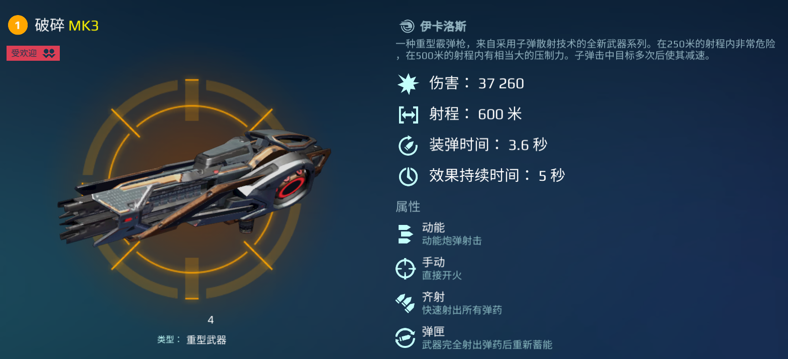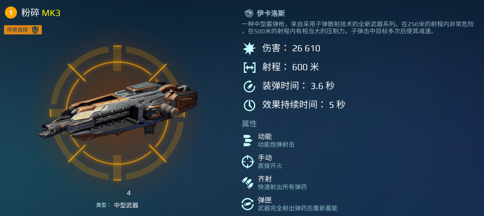 “减速喷”[破碎]、[粉碎]、[裂碎]属于中近程动能霰弹枪。该系列武器的输出伤害对装备物理护盾的目标效果显著,在高精度、零散射的特性支持下,其有效作战范围可覆盖250米至500米。