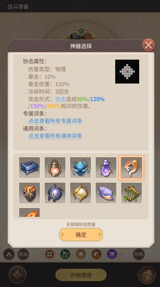 游戏开始时,在准备阶段可以从多个神器中选择一个上场(图2)。游戏过程中他会持续跟着玩家行动。在一定回合后,他会发动一次协击,对范围内的怪物造成伤害,神器的协击伤害数值与角色“知识”属性挂钩。