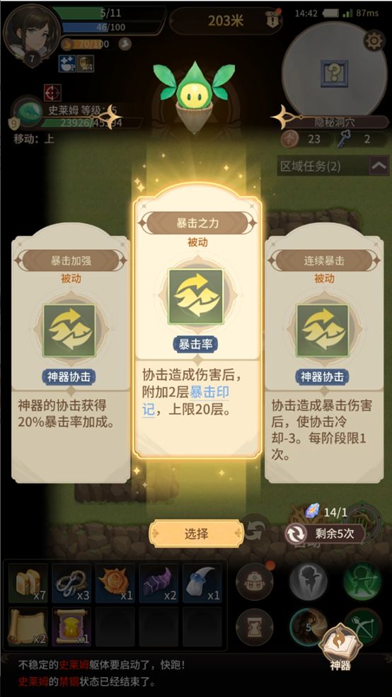 当然,协击只是这玩意的基础功能,在游戏过程中你会遇到“神器强化石”,拾取它以后,神器能获得各种强化效果,升级效果是三选一(图3)。