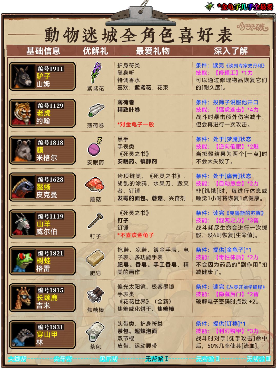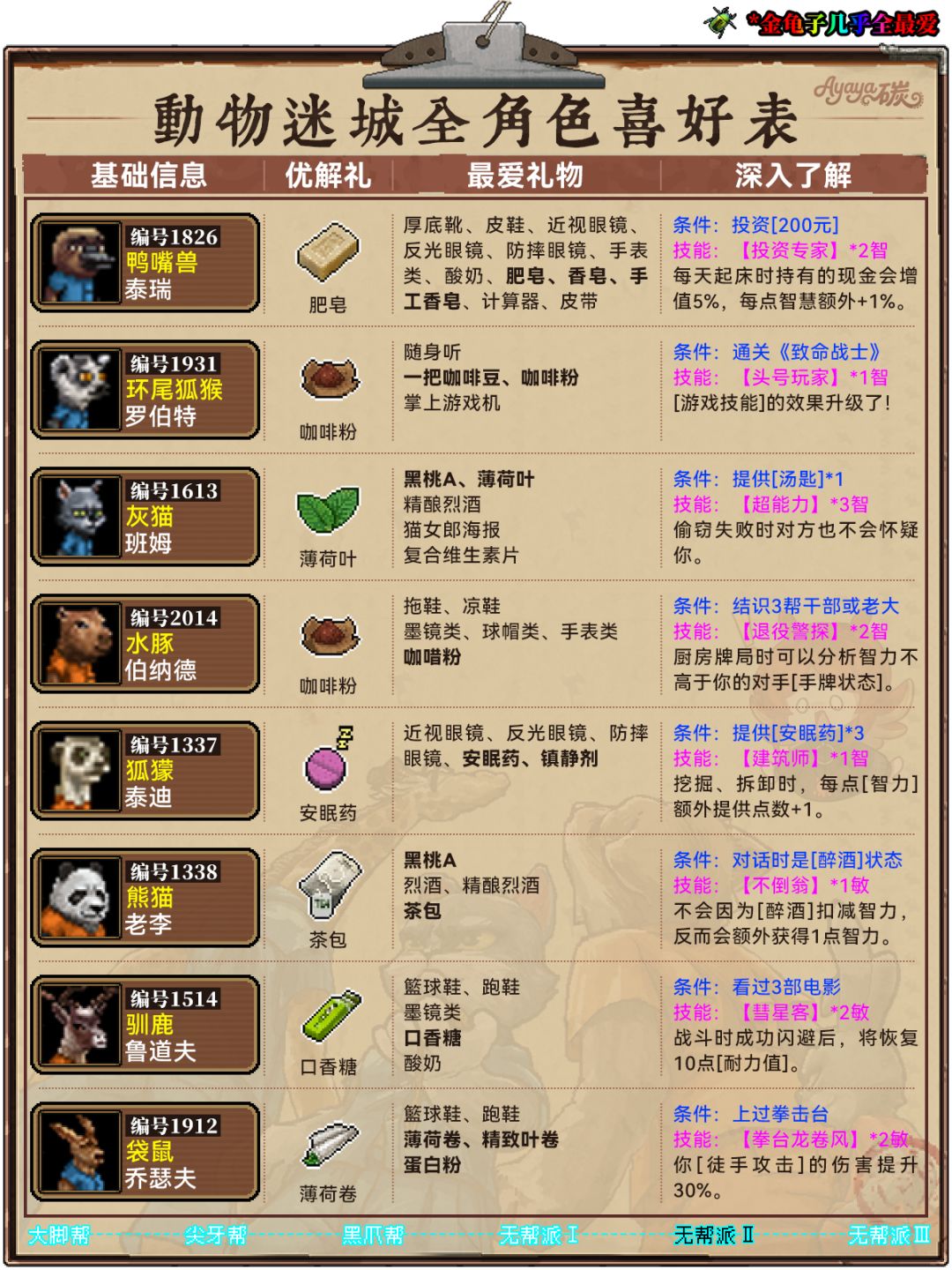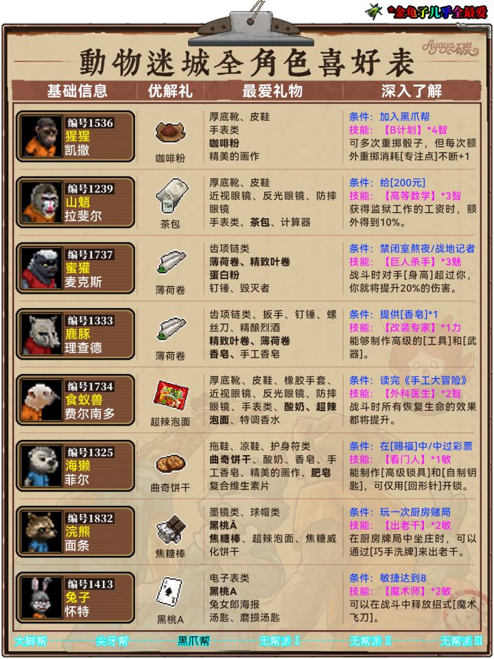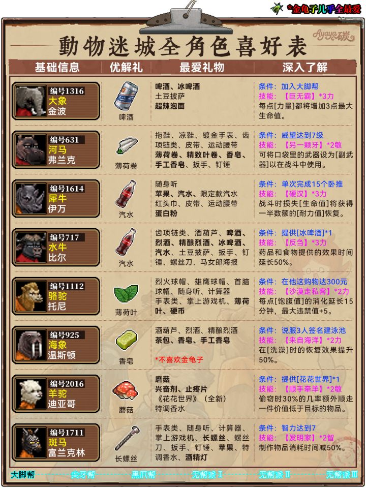 《动物迷城》全角色喜好表终于整理出来了!在最爱礼物中挑选了一个“性价比最高”的方便大家参考!