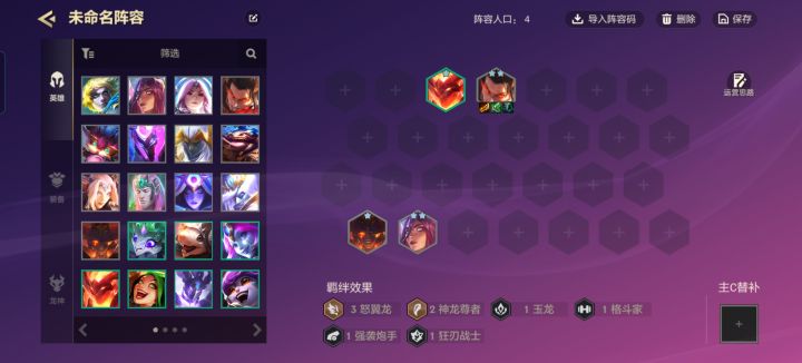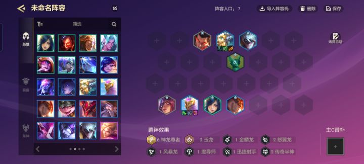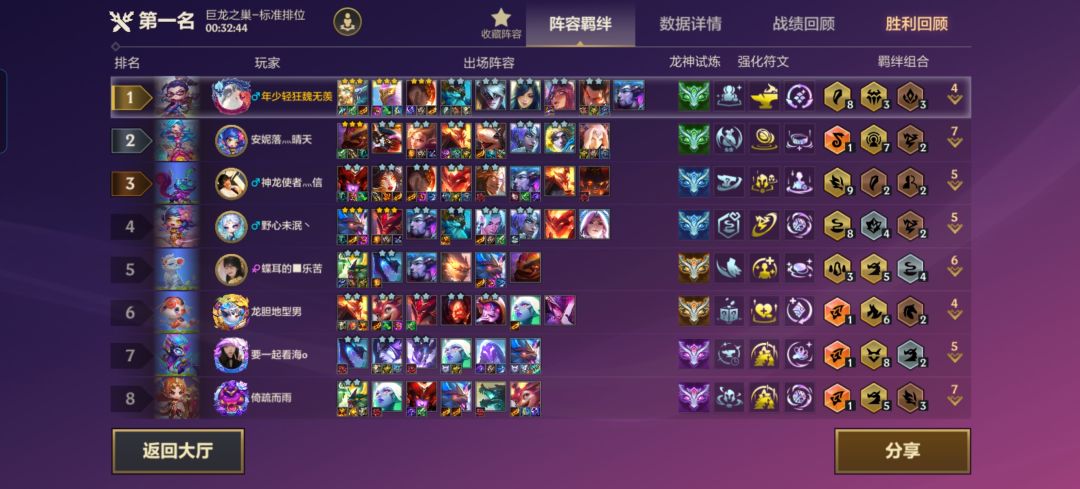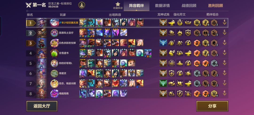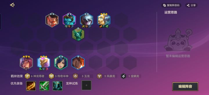 3.后期升到8级滴出三星狗熊开出6神龙3传奇半神,前面狗熊链接李青(李青装备给狂徒、反甲、龙牙),奥恩(多余的坦装给奥恩)链接瑟提,艾妮欧亚(装备青龙刀、大书、法爆)链接卡尔玛(多余的法装给她),这就算成型了。
