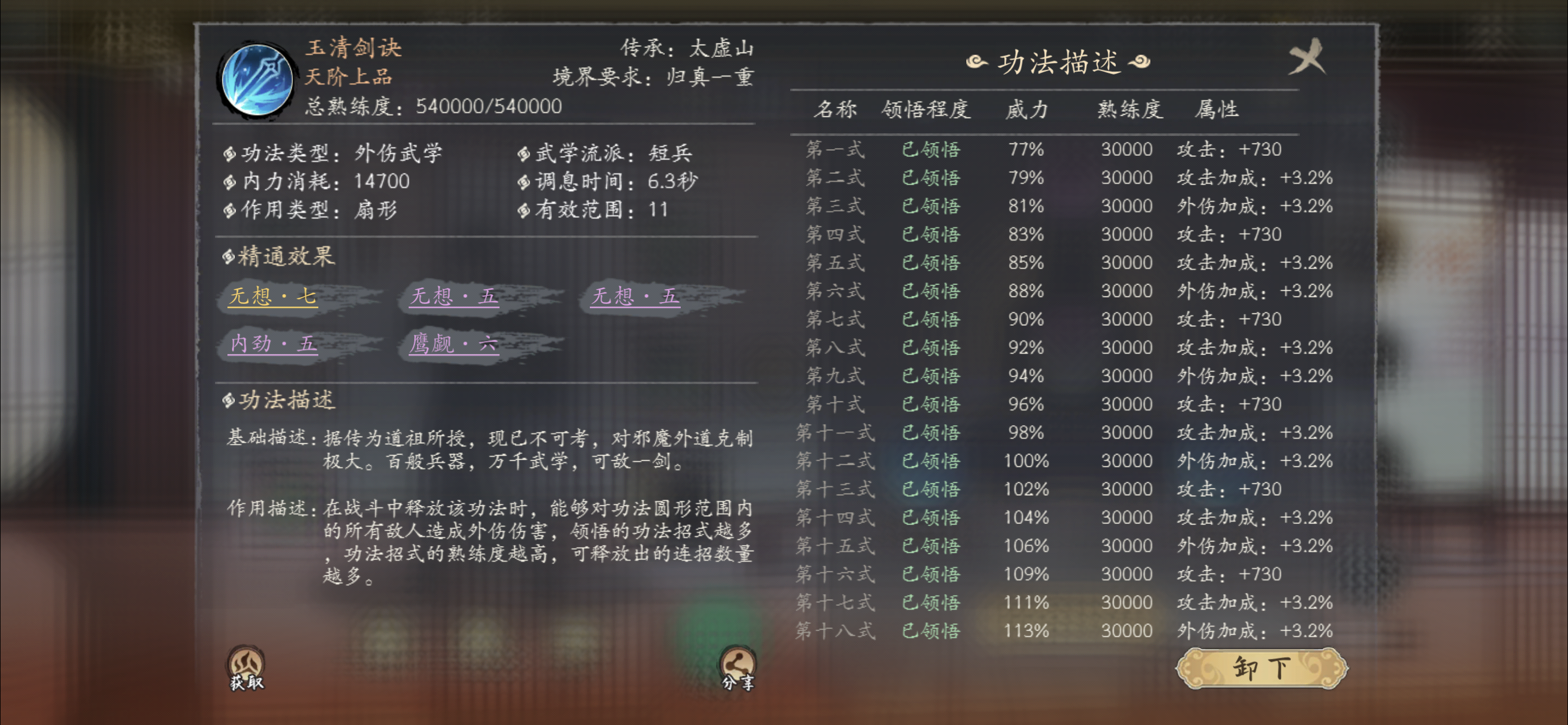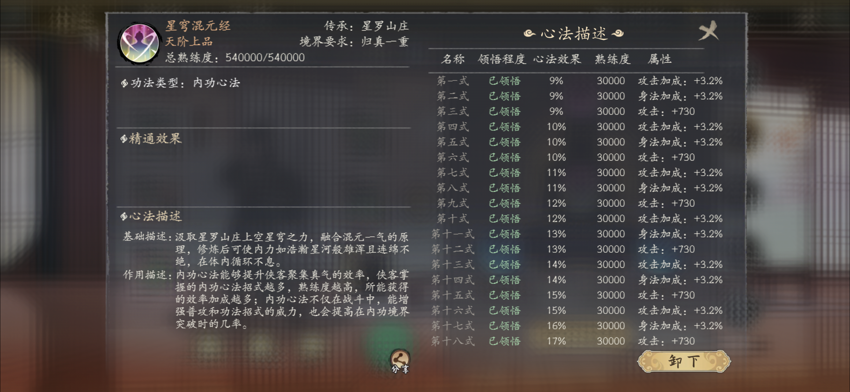 7.值得注意的是 无论人下 地下 天下功法 都可以通过达到相应境界提升功法品阶 无需重新再学功法覆盖 如图1右下角卸下会变成提升品阶 需满熟练度